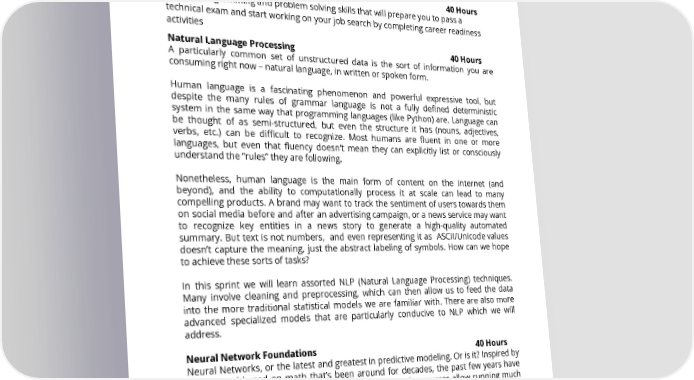 Productization and Cloud 40 Hours For a computer program to be “real”, it has to be available – these days, that means deployed to the cloud. But what is the cloud, and what does it mean to build and deploy something to it? We’ll learn that and more in this sprint. Applied Computer Science 3 40 Hours Explore programming and problem solving skills that will prepare you to pass a technical exam and start working on your job search by completing career readiness activities Natural Language Processing 40 Hours A particularly common set of unstructured data is the sort of information you are consuming right now – natural language, in written or spoken form. Human language is a fascinating phenomenon and powerful expressive tool, but despite the many rules of grammar language is not a fully defined deterministic system in the same way that programming languages (like Python) are. Language can be thought of as semi-structured, but even the structure it has (nouns, adjectives, verbs, etc.) can be difficult to recognize. Most humans are fluent in one or more languages, but even that fluency doesn’t mean they can explicitly list or consciously understand the “rules” they are following. Nonetheless, human language is the main form of content on the Internet (and beyond), and the ability to computationally process it at scale can lead to many compelling products. A brand may want to track the sentiment of users towards them on social media before and after an advertising campaign, or a news service may want to recognize key entities in a news story to generate a high-quality automated summary. But text is not numbers, and even representing it as ASCII/Unicode values doesn’t capture the meaning, just the abstract labeling of symbols. How can we hope to achieve these sorts of tasks? In this sprint we will learn assorted NLP (Natural Language Processing) techniques. Many involve cleaning and preprocessing, which can then allow us to feed the data into the more traditional statistical models we are familiar with. There are also more advanced specialized models that are particularly conducive to NLP which we will address. Neural Network Foundations 40 Hours Neural Networks, or the latest and greatest in predictive modeling. Or is it? Inspired by biology and based on math that’s been around for decades, the past few years have seen some pretty impressive results as computational resources allow running much larger networks. Major Neural Network Architectures 40 Hours Now that you've learned the foundations of Neural Networks, it's time to go deep! All "deep learning" really means is "there's at least some hidden layers," but there's a Page 43 of 58 REV 10/31/2022 This catalog applies to all students other than those who reside in CA, CO, GA, TX, and DC who have their own catalogs.