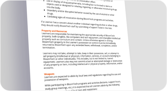 ● Consuming alcohol and other drugs during school hours. Other drugs include, but are not limited to, cannabis (in all forms), controlled substances, prescriptions (when used in any manner and/or by any person other than what has been prescribed by a medical professional), and the use of synthetic or natural substances ingested for an intoxication effect. ● Use or display of drug paraphernalia, including but not limited to items or objects used or designed for inhaling, ingesting, or otherwise introducing drugs into the body. ● Disorderly and/or disruptive behavior caused by the use of alcohol or other drugs. ● Exhibiting signs of intoxication during BloomTech programs and activities. If a Learner has a concern about another individual regarding alcohol or other drugs, they should notify BloomTech staff by submitting a Support Ticket in the Hub. Property and Resources Learners are responsible for maintaining the appropriate security of BloomTech property, both tangible, like computers and tech equipment, and intangible intellectual property such as curriculum and content. Unless otherwise agreed in writing, BloomTech property in the Learner's possession or control must be immediately returned to BloomTech upon any extended leave, withdrawal, completion, and/or termination. Learners may not take, attempt to take, keep in their possession, sell, or attempt to sell property (intellectual or physical), information, services, or accounts belonging to BloomTech or other individual(s). This includes, but is not limited to, loaned equipment. Learners also may not commit actual or attempted damage or destruction of any property or item, including intellectual or physical property, information, and/or accounts. Weapons Learners are expected to abide by local laws and regulations regarding the use and possession of weapons. While participating in BloomTech programs and activities (lectures, support hours, study group meetings, etc.) it is expected that all Learners abide by the following expectations, regardless of local laws and regulations: ● Refrain from wielding, displaying, or using weapons or weapon paraphernalia while engaging in BloomTech programs and activities ○ Weapons include, but are not limited to: firearms, explosives, knives, clubs, martial arts weapons, swords, bows and arrows, hand grenades, or Page 25 of 58 REV 10/31/2022 This catalog applies to all students other than those who reside in CA, CO, GA, TX, and DC who have their own catalogs.
