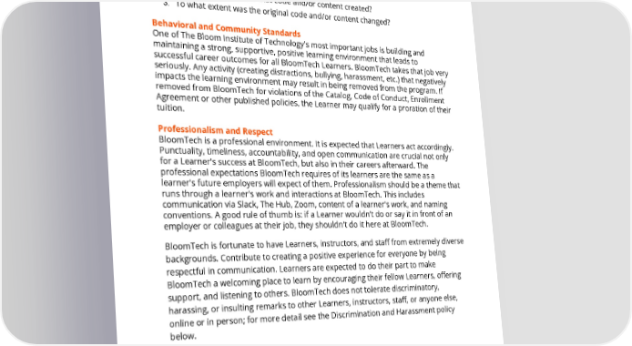 For any project you are submitting, you should be able to set research tools and notes aside and write your own code. In investigating suspected academic integrity violations, BloomTech staff may use the following questions to evaluate the situation: 1. Who created the original code and/or content? 2. For what purpose was that code and/or content created? 3. To what extent was the original code and/or content changed? Behavioral and Community Standards One of The Bloom Institute of Technology's most important jobs is building and maintaining a strong, supportive, positive learning environment that leads to successful career outcomes for all BloomTech Learners. BloomTech takes that job very seriously. Any activity (creating distractions, bullying, harassment, etc.) that negatively impacts the learning environment may result in being removed from the program. If removed from BloomTech for violations of the Catalog , Code of Conduct, Enrollment Agreement or other published policies, the Learner may qualify for a proration of their tuition. Professionalism and Respect BloomTech is a professional environment. It is expected that Learners act accordingly. Punctuality, timeliness, accountability, and open communication are crucial not only for a Learner's success at BloomTech, but also in their careers afterward. The professional expectations BloomTech requires of its learners are the same as a learner's future employers will expect of them. Professionalism should be a theme that runs through a learner's work and interactions at BloomTech. This includes communication via Slack, The Hub, Zoom, content of a learner's work, and naming conventions. A good rule of thumb is: if a Learner wouldn’t do or say it in front of an employer or colleagues at their job, they shouldn't do it here at BloomTech. BloomTech is fortunate to have Learners, instructors, and staff from extremely diverse backgrounds. Contribute to creating a positive experience for everyone by being respectful in communication. Learners are expected to do their part to make BloomTech a welcoming place to learn by encouraging their fellow Learners, offering support, and listening to others. BloomTech does not tolerate discriminatory, harassing, or insulting remarks to other Learners, instructors, staff, or anyone else, online or in person; for more detail see the Discrimination and Harassment policy below. Alcohol and Other Drugs Learners are expected to abide by local laws and regulations regarding the use of alcohol and other drugs. In addition, the following are considered violations if a learner does so while participating in BloomTech programs and activities: Page 24 of 58 REV 10/31/2022 This catalog applies to all students other than those who reside in CA, CO, GA, TX, and DC who have their own catalogs.