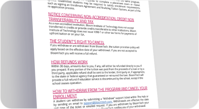 ● Almost all courses are taught on Pacific Time so it is important to think about how you will adjust according to your time zone. READMISSION POLICY If eligible, withdrawn students may apply for readmission into the same program. Re-admitted students may be required to complete a placement exam or repeat sprints. Readmitted students may be required to satisfy enrollment requirements, such as signing an Enrollment Agreement and finalizing Tuition Options, as part of the re-application process. NOTICE CONCERNING NON-ACCREDITATION, CREDIT NON TRANSFERABILITY, AND TAX As a non-accredited institution, Bloom Institute of Technology does not accept transferred-in credits or provide credits transferable to other institutions. Bloom Institute of Technology does not issue 1098-T or other tax forms for payments of upfront tuition or on your ISA. THE STUDENT’S RIGHT TO CANCEL If you withdraw or are withdrawn from BloomTech, the tuition proration policy will apply based on the effective date of your withdrawal. If you are not accepted to BloomTech you will receive a full refund. HOW REFUNDS WORK Within 30 days, amounts due to you, if any, will either be refunded directly to you if you prepaid. If any portion of the tuition was paid from the proceeds of a loan or by a third party, applicable refund shall be sent to the lender, third party or, if appropriate, to the state or federal agency that guaranteed or reinsured the loan. BloomTech will provide a full refund if education service is discontinued by the school, except if the school ceases operation. HOW TO WITHDRAW FROM THE PROGRAM AND CANCEL YOUR ENROLLMENT A student can withdraw by submitting a “Withdraw” support ticket within The Hub or by sending an email to [email protected]. Withdrawals are effective the date and time of the ticket or emailed request. If you are withdrawn by BloomTech your effective date of termination is the date BloomTech notifies you of your withdrawal. REFUND POLICY You will owe a prorated tuition amount if you have completed less than 50% of the program (<50%). Once you have completed 50% or more (≥50%) of the program you will not receive a refund. Please see the chart below. If you withdraw prior to Page 13 of 58 REV 10/31/2022 This catalog applies to all students other than those who reside in CA, CO, GA, TX, and DC who have their own catalogs.