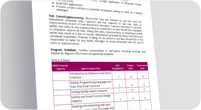 4. OPTIONAL: Ability to purchase 0.1 ETH for deploying to Ethereum mainnet Program Objectives: Upon successful completion of this program, students should be able to: ● Deploy smart contracts and ancillary services to Ethereum mainnet ● Write secure & efficient contracts through application of Ethereum Virtual Machine (EVM) ● Build DeFi applications ● Produce project artifacts to potential employers leading to work as a Solidity developer Test Coins/Cryptocurrency: BloomTech may ask learners to use test coins for educational purposes only. Learners are not required to use real coins or cryptocurrency as part of their BloomTech education. Learners who elect to use their wallet, real coins, or any cryptocurrency in connection to their BloomTech education or otherwise, assume all risks. Using real coins, cryptocurrency, or attaching a virtual wallet may result in a loss of money. Information provided by BloomTech does not constitute investment, financial, trading, or tax advice in any way. BloomTech is not responsible or liable for any losses, damages or claims associated with the use of coins or cryptocurrency. Program Schedule: Content consumption is self-paced including evenings and weekends. Regular office hours are generally available. Time is in hours Web3 Courses Skill Project Total Sprint / Sprints Sprint Course Title Acquisition* “Labs” Time Introduction to Ethereum and Smart Contracts 5 10 15 Solidity Programming Language and Your First Smart Contract 5 10 15 Testing Solidity Smart Contracts 5 10 15 Solidity and Smart Contract Design Patterns 5 10 15 Reading and Interacting with your Smart Contract using The Graph and React 5 10 15 Monitoring Your Protocol 5 10 15 Blockchain Cryptography and the Ethereum Virtual Machine (EVM) 5 10 15 Page 51 of 58 REV 10/31/2022 This catalog applies to all students other than those who reside in CA, CO, GA, TX, and DC who have their own catalogs.