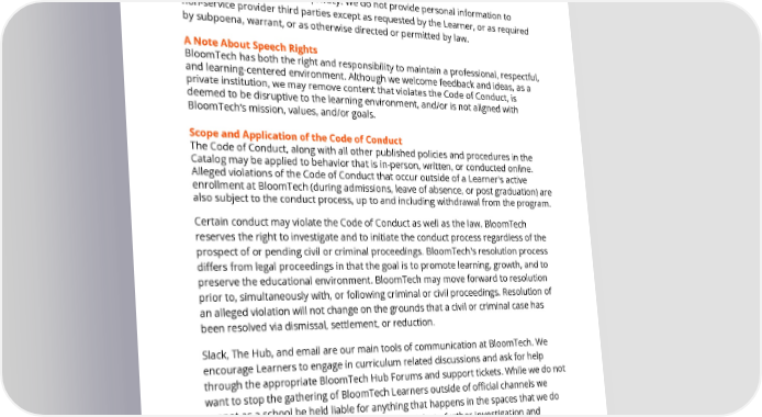 explicitly stated, they should reach out in a Support Ticket for clarification. Learners also have the responsibility to remain in communication with BloomTech administration, by checking their email, reading and engaging in Slack channels and direct messages, and reading all school announcements. BloomTech protects Learner privacy. We do not provide personal information to non-service provider third parties except as requested by the Learner, or as required by subpoena, warrant, or as otherwise directed or permitted by law. A Note About Speech Rights BloomTech has both the right and responsibility to maintain a professional, respectful, and learning-centered environment. Although we welcome feedback and ideas, as a private institution, we may remove content that violates the Code of Conduct, is deemed to be disruptive to the learning environment, and/or is not aligned with BloomTech’s mission, values, and/or goals. Scope and Application of the Code of Conduct The Code of Conduct, along with all other published policies and procedures in the Catalog may be applied to behavior that is in-person, written, or conducted online. Alleged violations of the Code of Conduct that occur outside of a Learner's active enrollment at BloomTech (during admissions, leave of absence, or post graduation) are also subject to the conduct process, up to and including withdrawal from the program. Certain conduct may violate the Code of Conduct as well as the law. BloomTech reserves the right to investigate and to initiate the conduct process regardless of the prospect of or pending civil or criminal proceedings. BloomTech's resolution process differs from legal proceedings in that the goal is to promote learning, growth, and to preserve the educational environment. BloomTech may move forward to resolution prior to, simultaneously with, or following criminal or civil proceedings. Resolution of an alleged violation will not change on the grounds that a civil or criminal case has been resolved via dismissal, settlement, or reduction. Slack, The Hub, and email are our main tools of communication at BloomTech. We encourage Learners to engage in curriculum related discussions and ask for help through the appropriate BloomTech Hub Forums and support tickets. While we do not want to stop the gathering of BloomTech Learners outside of official channels we cannot as a school be held liable for anything that happens in the spaces that we do not govern. However, the school reserves the right to further investigation and possible removal of a Learner for offenses such as bullying, harassment, etc. if such behavior is brought to our attention. Policies in the Catalog , including but not limited to the Code of Conduct, may be enforceable for incidents that happen outside of BloomTech that affect the BloomTech Page 20 of 58 REV 10/31/2022 This catalog applies to all students other than those who reside in CA, CO, GA, TX, and DC who have their own catalogs.