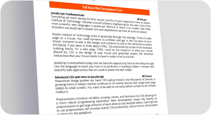 20 140 Bloom Institute of Technology 1 - 4 Total Labs Hours 20 140 Total Program Hours 960 COURSE DESCRIPTIONS Full Stack Web Development Core JavaScript Fundamentals 40 Hours Everything we teach during the first couple months of your experience here at Bloom Institute of Technology revolves around software engineering for the web. One of the most powerful web languages is JavaScript. Without it, there is no modern web. Web browsers use JavaScript to power rich user experiences we have all come to expect. Bloom Institute of Technology looks at JavaScript through this analogy. Think of a web page as a house. You need someone to architect and get in the structure of your house, someone to add in the design, and someone to add in the electricity to power the house. If you were to think about HTML, CSS and JavaScript as the three necessary building blocks, for a web page, HTML could be the blueprint of what your house should be, CSS is the design of your house and JavaScript powers the electrical interactions that your house needs to have in order to be functional. JavaScript is everywhere today! And we have the opportunity here to dive deep enough into the language to teach you how to be proficient in building modern, complex and beautiful web applications that are used to power the web today! Advanced CSS and Intro to JavaScript 40 Hours Responsive design pushes our basic CSS styling forward into thousands of devices. A growing trend in today’s market continues to be mobile devices that range from large tablets to small screens. You need to be able to correctly deliver content to all of these mediums. Preprocessors introduce variables, scoping, mixins, and functions into CSS allowing for a more robust programming experience. Most development shops rely heavily on preprocessors to get large amounts of work done across multiple teams. Learning how to use preprocessors will increase overall CSS productivity, reduce errors, and prepare students for the workplace. Preprocessing is a great introduction to JavaScript concepts like scope, variables, and DRY code paradigms. User Interface and Git 40 Hours Having the ability to craft user interfaces is key for full stack web developers in all organizations. Another key ability for professional developers is knowing how to use Page 36 of 58 REV 10/31/2022 This catalog applies to all students other than those who reside in CA, CO, GA, TX, and DC who have their own catalogs.