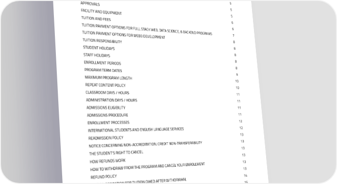 TABLE OF CONTENTS WELCOME MESSAGE 4 MISSION 5 OBJECTIVES 5 HISTORY 5 APPROVALS 5 FACILITY AND EQUIPMENT 6 TUITION AND FEES 6 TUITION PAYMENT OPTIONS FOR FULL STACK WEB, DATA SCIENCE, & BACKEND PROGRAMS 7 TUITION PAYMENT OPTIONS FOR WEB3 DEVELOPMEN T 8 TUITION RESPONSIBILITY 8 STUDENT HOLIDAYS 8 STAFF HOLIDAYS 8 ENROLLMENT PERIODS 8 PROGRAM TERM DATES 9 MAXIMUM PROGRAM LENGTH 10 REPEAT CONTENT POLICY 10 CLASSROOM DAYS / HOURS 11 ADMINISTRATION DAYS / HOURS 11 ADMISSIONS ELIGIBILITY 11 ADMISSIONS PROCEDURE 11 ENROLLMENT PROCESSES 12 INTERNATIONAL STUDENTS AND ENGLISH LANGUAGE SERVICES 12 READMISSION POLICY 13 NOTICE CONCERNING NON-ACCREDITATION, CREDIT NON-TRANSFERABILITY 1 3 THE STUDENT’S RIGHT TO CANCEL 13 HOW REFUNDS WORK 13 HOW TO WITHDRAW FROM THE PROGRAM AND CANCEL YOUR ENROLLMENT 13 REFUND POLICY 13 TUITION PRORATION FOR TUITION OWED AFTER WITHDRAWAL 14 BLOOM INSTITUTE OF TECHNOLOGY ’S RIGHT TO WITHDRAW OR TERMINATE 16 WITHDRAWAL 17 GRADING SYSTEM 17 SATISFACTORY PROGRESS 18 ACADEMIC PROBATION 18 Page 2 of 58 REV 10/31/2022 This catalog applies to all students other than those who reside in CA, CO, GA, TX, and DC who have their own catalogs.