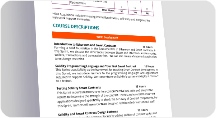 Ethereum Tokens, ERC20 and ERC-721 (NFT) 5 10 15 Decentralized Finance (DeFi) 5 10 15 Hacking Smart Contracts: Devastating Vulnerabilities Gas Optimization 5 10 15 Total Hours 50 100 150 *Skill Acquisition includes: viewing instructional videos, self-study and 1:1/group live instructor support as needed. COURSE DESCRIPTIONS WEB3 Development Introduction to Ethereum and Smart Contracts 15 Hours Forming a solid foundation in the fundamentals of Ethereum and Smart Contracts. In this Sprint, we discuss the differences between Bitcon and Ethereum; explain nodes, wallets, transactions and transaction fees. We will also create a Metamask application to exchange test coins. Solidity Programming Language and Your First Smart Contract 15 Hours This Sprint uses Solidity as the framework for teaching Smart Contract development, In this Sprint, we introduce learners to the programming languages and applications required to support Solidity. We concentrate on Solidity’s syntax and deploy a contract to a testnet. Testing Solidity Smart Contracts 15 Hours This Sprint requires learners to write a comprehensive test suite and analyze the results to determine the strength of the contract. The test suite consists of current applications designed specifically to check the accuracy of Contract components. For this Sprint, learners will use a Contract designed by BloomTech Instructional staff. Solidity and Smart Contract Design Patterns 15 Hours This Sprint builds on the previous Sprints by adding additional complex syntax and library functions. Learners will create and deploy a contract on Ethereum and ask proposers and solvers to contribute through calling functions. Reading and Interacting with your Smart Contract using The Graph and React 15 Hours Page 52 of 58 REV 10/31/2022 This catalog applies to all students other than those who reside in CA, CO, GA, TX, and DC who have their own catalogs.