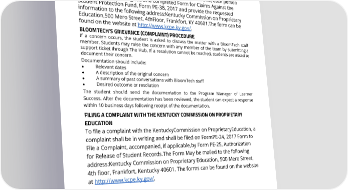 incurred due to the closing of a school, discontinuance of a program, loss of license, or loss of accreditation by a school or program. PROCESS FOR FILING A CLAIM AGAINST THE STUDENT PROTECTION FUND To file a claim against the Kentucky Student ProtectionFund, each person filing must submit a signed and completed Form for Claims Against the Student Protection Fund, Form PE-38, 2017 and provide the requested information to the following address:Kentucky Commission on Proprietary Education,500 Mero Street, 4thFloor, Frankfort, KY 40601.The form can be found on the website at http://www.kcpe.ky.gov/ . BLOOMTECH’S GRIEVANCE (COMPLAINT) PROCEDURE If a concern occurs, the student is asked to discuss the matter with a BloomTech staff member. Students may raise the concern with any member of the team by submitting a support ticket through The Hub. If a resolution cannot be reached, students are asked to document their concern. Documentation should include: ● Relevant dates ● A description of the original concern ● A summary of past conversations with BloomTech staff ● Desired outcome or resolution The student should send the documentation to the Program Manager of Learner Success. After the documentation has been reviewed, the student can expect a response within 10 business days following receipt of the documentation. FILING A COMPLAINT WITH THE KENTUCKY COMMISSION ON PROPRIETARY EDUCATION To file a complaint with the KentuckyCommission on ProprietaryEducation, a complaint shall be in writing and shall be filed on FormPE-24, 2017 Form to File a Complaint, accompanied, if applicable,by Form PE-25, Authorization for Release of Student Records.The Form May be mailed to the following address:Kentucky Commission on Proprietary Education, 500 Mero Street, 4th floor, Frankfort, Kentucky 40601. The forms can be found on the website at http://www.kcpe.ky.gov/ . Page 58 of 58 REV 10/31/2022 This catalog applies to all students other than those who reside in CA, CO, GA, TX, and DC who have their own catalogs.