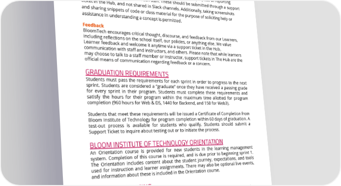 ● Create, store, share, or distribute created likeness of any person(s) without prior knowledge or permission. This includes, but is not limited to, emojis, gifs, and memes. Please note that screenshots may be taken and used for the purpose of reporting behavioral concerns to BloomTech staff. These should be submitted through a support ticket in the Hub, and not shared in Slack channels. Additionally, taking screenshots and sharing snippets of code or class material for the purpose of soliciting help or assistance in understanding a concept is permitted. Feedback BloomTech encourages critical thought, discourse, and feedback from our Learners, including reflections on the school itself, our policies, or anything else. We value Learner feedback and welcome it anytime via a support ticket in the Hub, communication with staff and instructors, and others. Please note that while learners may choose to talk to a staff member or instructor, support tickets in The Hub are the official means of communication regarding feedback or a concern. GRADUATION REQUIREMENTS Students must pass the requirements for each sprint in order to progress to the next sprint. Students are considered a “graduate” once they have received a passing grade for every sprint in their program. Students must complete these requirements and satisfy the hours for their program within the maximum time allotted for program completion (960 hours for Web & DS, 1440 for Backend, and 150 for Web3). Students that meet these requirements will be issued a Certificate of Completion from Bloom Institute of Technology for program completion within 60 days of graduation. A test-out process is available for students who qualify. Students should submit a Support Ticket to inquire about testing out or to initiate the process. BLOOM INSTITUTE OF TECHNOLOGY ORIENTATION An Orientation course is provided for new students in the learning management system. Completion of this course is required, and is due prior to beginning sprint 1. The Orientation includes content about the student journey, expectations, and tools used for instruction and learner assignments. There may also be optional live events, and information about these is included in the Orientation course. ACADEMIC ADVISING Academic advising may be initiated by Bloom Institute of Technology personnel or the student when the need is identified. Students may initiate academic advising by submitting a support ticket in The Hub. Page 30 of 58 REV 10/31/2022 This catalog applies to all students other than those who reside in CA, CO, GA, TX, and DC who have their own catalogs.