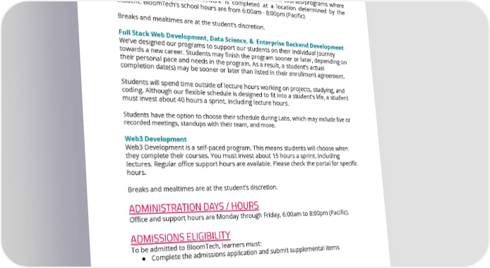 achieve. Students that are not demonstrating adequate effort or progress may be withdrawn from the program. CLASSROOM DAYS / HOURS Bloom Institute of Technology provides distance education courses/programs where the distance education coursework is completed at a location determined by the student. BloomTech’s school hours are from 6:00am - 8:00pm (Pacific). Breaks and mealtimes are at the student’s discretion. Full Stack Web Development, Data Science, & Enterprise Backend Development We’ve designed our programs to support our students on their individual journey towards a new career. Students may finish the program sooner or later, depending on their personal pace and needs in the program. As a result, a student’s actual completion date(s) may be sooner or later than listed in their enrollment agreement. Students will spend time outside of lecture hours working on projects, studying, and coding. Although our flexible schedule is designed to fit into a student’s life, a student must invest about 40 hours a sprint, including lecture hours. Students have the option to choose their schedule during Labs, which may include live or recorded meetings, standups with their team, and more. Web3 Development Web3 Development is a self-paced program. This means students will choose when they complete their courses. You must invest about 15 hours a sprint, including lectures. Regular office support hours are available. Please check the portal for specific hours. Breaks and mealtimes are at the student’s discretion. ADMINISTRATION DAYS / HOURS Office and support hours are Monday through Friday, 6:00am to 8:00pm (Pacific). ADMISSIONS ELIGIBILITY To be admitted to BloomTech, learners must: ● Complete the admissions application and submit supplemental items ADMISSIONS PROCEDURE Prospective students are invited and encouraged to explore the website to learn more Prospective learners are encouraged to explore our web resources to learn more about Bloom Institute of Technology courses and admissions at https://www.bloomtech.com/admissions To apply: Page 11 of 58 REV 10/31/2022 This catalog applies to all students other than those who reside in CA, CO, GA, TX, and DC who have their own catalogs.