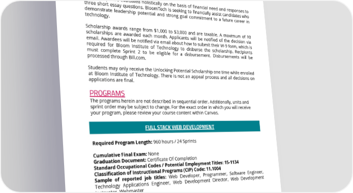 Application Process Applicants must meet eligibility criteria, including having been admitted to Bloom Institute of Technology, and submit a complete Scholarship Application for consideration. Scholarships are evaluated holistically on the basis of financial need and responses to three short essay questions. BloomTech is seeking to financially assist candidates who demonstrate leadership potential and strong goal commitment to a future career in technology. Scholarship awards range from $1,000 to $3,000 and are taxable. A maximum of 10 scholarships are awarded each month. Applicants will be notified of the decision via email. Awardees will be notified via email about how to submit their W-9 form, which is required for Bloom Institute of Technology to disburse the scholarship. Recipients must complete Sprint 2 to be eligible for a disbursement. Disbursements will be processed through Bill.com. Students may only receive the Unlocking Potential Scholarship one time while enrolled at Bloom Institute of Technology. There is not an appeal process and all decisions on applications are final. PROGRAMS The programs herein are not described in sequential order. Additionally, units and sprint order may be subject to change. For the exact order in which you will receive your program, please review your course content within Canvas. FULL STACK WEB DEVELOPMENT Required Program Length: 960 hours / 24 Sprints Cumulative Final Exam: None Graduation Document: Certificate Of Completion Standard Occupational Codes / Potential Employment Titles: 15-1134 Classification of Instructional Programs (CIP) Code: 11.1004 Sample of reported job titles: Web Developer, Programmer, Software Engineer, Technology Applications Engineer, Web Development Director, Web Development Instructor, Webmaster Program Description: This program teaches the foundations of web development and computer science. Students will learn full-stack development with some of the most in-demand technologies. Upon successful completion of the program, students will have built and worked on multiple apps. This course of instruction prepares individuals for entry-level jobs such as: web developer, front-end developer, backend developer, and full-stack Page 34 of 58 REV 10/31/2022 This catalog applies to all students other than those who reside in CA, CO, GA, TX, and DC who have their own catalogs.