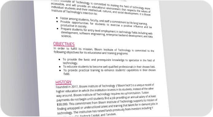 MISSION The mission of Bloom Institute of Technology is to unlock potential, regardless of circumstance. That means working with untapped or underutilized talent, and training that talent for in-demand careers in the technology fields including web development, engineering, enterprise backend development, and data science. Bloom Institute of Technology is committed to making the field of technology more accessible, and will provide an educational environment that respects the values of individual students and their intellectual, cultural, and social development. It is Bloom Institute of Technology’s intention to: ● Foster among students, faculty, and staff a commitment to life-long learning. ● Provide opportunities for students to exercise a positive influence and be productive in society. ● Prepare students for entry-level employment in technology fields including web development, software engineering, enterprise backend development, and data science. OBJECTIVES In order to fulfill its mission, Bloom Institute of Technology is committed to the following objectives for its educational and training programs: ● To provide the basic and prerequisite knowledge to specialize in the field of technology. ● To educate students to become well-qualified professionals in their chosen field. ● To provide practical training to enhance students’ capabilities in their chosen field. HISTORY Founded in 2017, Bloom Institute of Technology (“BloomTech”) is a unique model of higher education in which the institution invests in its students, instead of the other way around. Bloom Institute of Technology requires no upfront tuition. Tuition payments do not begin until students find a job providing an annual salary of at least $50,000. This commitment from Bloom Institute of Technology supports its mission of finding untapped or underutilized talent and training that talent for in-demand jobs in technology. The institution has raised funds previously from investors including Y Combinator, GV, Bedrock Capital, and Tandem. APPROVALS Bloom Institute of Technology is approved to operate by Michigan’s Department of Labor and Economic Opportunity - Workforce development-Postsecondary Schools, Utah’s Department of Commerce and other various state education bureaus. Page 5 of 58 REV 10/31/2022 This catalog applies to all students other than those who reside in CA, CO, GA, TX, and DC who have their own catalogs.