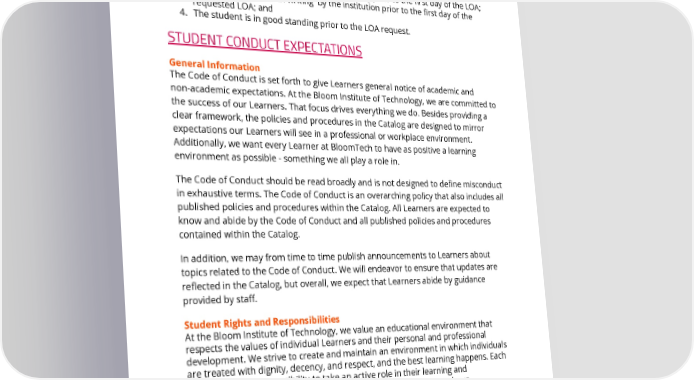 LEAVE OF ABSENCE POLICY A leave of absence (LOA) or “Hiatus” will be considered and may be granted at the discretion of BloomTech Staff provided: 1. The LOA does not exceed 60 calendar days 2. The LOA is requested by the student in writing prior to the first day of the LOA; 3. The LOA is approved in writing by the institution prior to the first day of the requested LOA; and 4. The student is in good standing prior to the LOA request. STUDENT CONDUCT EXPECTATIONS General Information The Code of Conduct is set forth to give Learners general notice of academic and non-academic expectations. At the Bloom Institute of Technology, we are committed to the success of our Learners. That focus drives everything we do. Besides providing a clear framework, the policies and procedures in the Catalog are designed to mirror expectations our Learners will see in a professional or workplace environment. Additionally, we want every Learner at BloomTech to have as positive a learning environment as possible - something we all play a role in. The Code of Conduct should be read broadly and is not designed to define misconduct in exhaustive terms. The Code of Conduct is an overarching policy that also includes all published policies and procedures within the Catalog . All Learners are expected to know and abide by the Code of Conduct and all published policies and procedures contained within the Catalog . In addition, we may from time to time publish announcements to Learners about topics related to the Code of Conduct. We will endeavor to ensure that updates are reflected in the Catalog , but overall, we expect that Learners abide by guidance provided by staff. Student Rights and Responsibilities At the Bloom Institute of Technology, we value an educational environment that respects the values of individual Learners and their personal and professional development. We strive to create and maintain an environment in which individuals are treated with dignity, decency, and respect, and the best learning happens. Each learner has the responsibility to take an active role in their learning and understanding, and to contribute to an environment where all can learn. As agreed upon enrollment, Learners are responsible for reading and understanding the expectations and guidelines of BloomTech as stated in the Enrollment Agreement, Catalog , and Code of Conduct. If a Learner has questions about certain conduct, or whether an expectation applies in BloomTech's programs and activities, and it is not Page 19 of 58 REV 10/31/2022 This catalog applies to all students other than those who reside in CA, CO, GA, TX, and DC who have their own catalogs.