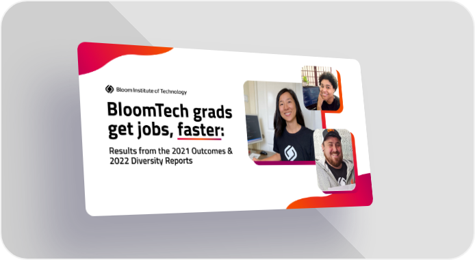 Check out the full 2021 Outcomes Report and the 2022 Diversity Report if you want to dive into the details. I’m pretty sure you’ll not only feel inspired, but also confident that we can help make your career goals a reality. Then I invite you to apply to BloomTech. When you join, you’ll get 3 weeks to test drive BloomTech—no financial commitments or credit cards necessary. It’s all a part of our model to help more people jumpstart tech careers, faster.
