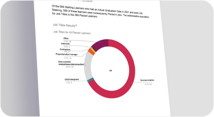 38 Job Titles The majority of 2021 BloomTech placed graduates work as developers/engineers. This field continues to offer opportunity, as employment in these roles is projected to grow by 25% by 39 2031 . We believe our data show that our graduates are meeting the industry’s hunger for developers and engineers. Job Titles Addressable Population Of the 668 Starting Learners who had an Actual Graduation Date in 2021 and were Job Seeking, 599 of these learners were subsequently Placed in jobs. The addressable population for Job Titles is the 599 Placed Learners. 40 Job Titles Results Job Titles for All Placed Learners 38 Management’s criterion for defining Job Title is determined from the job title of the learner's first Recorded Offer 39 Source: https://www.bls.gov/ooh/computer-and-information-technology/software-developers.htm 40 The addressable population for job titles calculations was 599 Placed Learners.