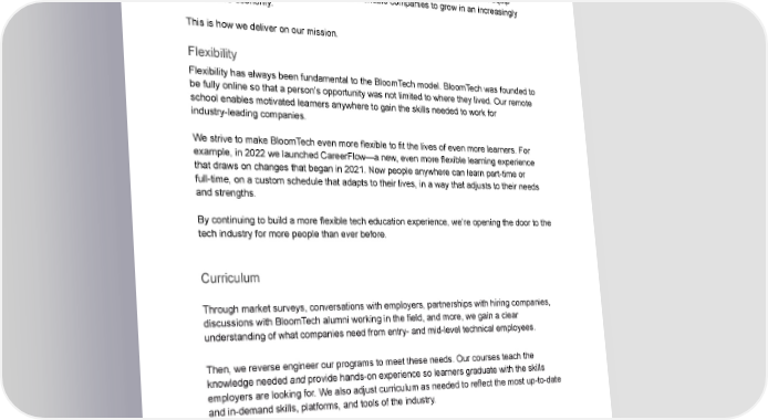 How BloomTech Works Our mission is as straightforward as it is impactful: We aim to provide a direct, low-risk path to a higher income. This mission serves individuals wanting to build a better future as well as employers looking for highly qualified workers. By training learners in what employers most need, we equip graduates to thrive in a changing market and enable companies to grow in an increasingly competitive economy. This is how we deliver on our mission. Flexibility Flexibility has always been fundamental to the BloomTech model. BloomTech was founded to be fully online so that a person’s opportunity was not limited to where they lived. Our remote school enables motivated learners anywhere to gain the skills needed to work for industry-leading companies. We strive to make BloomTech even more flexible to fit the lives of even more learners. For example, in 2022 we launched CareerFlow—a new, even more flexible learning experience that draws on changes that began in 2021. Now people anywhere can learn part-time or full-time, on a custom schedule that adapts to their lives, in a way that adjusts to their needs and strengths. By continuing to build a more flexible tech education experience, we’re opening the door to the tech industry for more people than ever before. Curriculum Through market surveys, conversations with employers, partnerships with hiring companies, discussions with BloomTech alumni working in the field, and more, we gain a clear understanding of what companies need from entry- and mid-level technical employees. Then, we reverse engineer our programs to meet these needs. Our courses teach the knowledge needed and provide hands-on experience so learners graduate with the skills employers are looking for. We also adjust curriculum as needed to reflect the most up-to-date and in-demand skills, platforms, and tools of the industry.