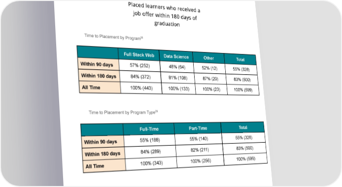 24 Time to Placement Results 25 Time to Placement by Program Full Stack Web Data Science Other Total 57% (252) 48% (64) 52% (12) 55% (328) Within 90 days 84% (372) 81% (108) 87% (20) 83% (500) Within 180 days 100% (443) 100% (133) 100% (23) 100% (599) All Time 26 Time to Placement by Program Type Full-Time Part-Time Total 55% (188) 55% (140) 55% (328) Within 90 days 84% (289) 82% (211) 83% (500) Within 180 days 100% (343) 100% (256) 100% (599) All Time 24 The addressable population for time to placement calculations was 599 Placed Learners 25 Time to Placement Results are shown cumulatively within a given column. Each row is a subset of the following rows, so columns will not add up to 100%. For example, every placed learner who is counted in “within 90 days” is also included in “within 180 days.” 26 Time to Placement Results are shown cumulatively within a given column. Each row is a subset of the following rows, so columns will not add up to 100%. For example, every placed learner who is counted in “within 90 days” is also included in “within 180 days.”