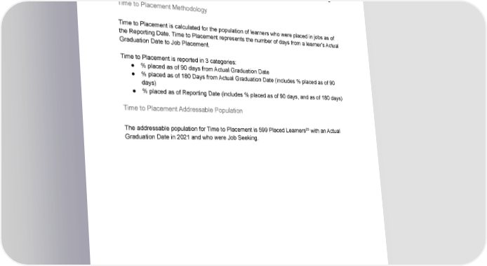 22 Time to Placement We also measure how long it takes our graduates to land jobs. When graduates are hired, they get to begin a rewarding career, and employers can fill openings needed to serve clients and grow their business. We are incredibly proud of our instructors, career support team, and entire staff for enabling learners to find jobs. Time to Placement Methodology Time to Placement is calculated for the population of learners who were placed in jobs as of the Reporting Date. Time to Placement represents the number of days from a learner’s Actual Graduation Date to Job Placement. Time to Placement is reported in 3 categories: ● % placed as of 90 days from Actual Graduation Date ● % placed as of 180 Days from Actual Graduation Date (includes % placed as of 90 days) ● % placed as of Reporting Date (includes % placed as of 90 days, and as of 180 days) Time to Placement Addressable Population 23 The addressable population for Time to Placement is 599 Placed Learners with an Actual Graduation Date in 2021 and who were Job Seeking. 22 Management’s criterion for defining Time to Placement is determined from how many Placed learners received job offer within X days of graduation 23 A learner whose Actual Graduation Date was in 2021 and who was subsequently placed in a job as of the Reporting Date August 11, 2022
