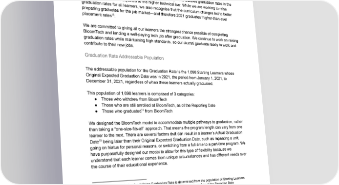 12 Graduation Rate There are various reasons learners do not graduate at their expected graduation date (including lingering effects of the COVID-19 pandemic). Our model enables learners to take longer than originally planned or take a hiatus, and some are still working toward completing their program. We believe more rigorous academic requirements may have lowered graduation rates in the short term as learners adjusted to the higher technical bar. While we are working to raise graduation rates for all learners, we also recognize that the curriculum changes led to better preparing graduates for the job market—and therefore 2021 graduates’ higher-than-ever 13 placement rates . We are committed to giving all our learners the strongest chance possible of completing BloomTech and landing a well-paying tech job after graduation. We continue to work on raising graduation rates while maintaining high standards, so our alumni graduate ready to work and contribute to their new jobs. Graduation Rate Addressable Population The addressable population for the Graduation Rate is the 1,698 Starting Learners whose Original Expected Graduation Date was in 2021, the period from January 1, 2021, to December 31, 2021, regardless of when these learners actually graduated. This population of 1,698 learners is comprised of 3 categories: ● Those who withdrew from BloomTech ● Those who are still enrolled at BloomTech, as of the Reporting Date 14 ● Those who graduated from BloomTech We designed the BloomTech model to accommodate multiple pathways to graduation, rather than taking a “one-size-fits-all” approach. That means the program length can vary from one learner to the next. There are several factors that can result in a learner’s Actual Graduation 15 Date being later than their Original Expected Graduation Date, such as repeating a unit, going on hiatus for personal reasons, or switching from a full-time to a part-time program. We have purposefully designed our model to allow for this type of flexibility because we understand that each learner comes from unique circumstances and has different needs over the course of their educational experience. 12 Management’s criterion for defining Graduation Rate is determined from the population of Starting Learners whose Original Expected Graduation Date is in 2021 and actually graduated as of the Reporting Date Reporting Date: August 11, 2022 Starting Learner: A learner who attended day 1 of Unit 2 of the coursework Original Expected Graduation Date: The date a learner is expected to graduate the program if they avoided repeating a unit or going on a hiatus; Unit is a combination of 4 sprints where each sprint is 1 week long course 13 Of 668 learners with an Actual Graduation Date in 2021 and who were Job Seeking, 599 (90%) received a job offer as of the reporting date 14 Includes learners who accepted a technical position prior to completion of their program 15 The date when a learner successfully completes the final sprint of their program