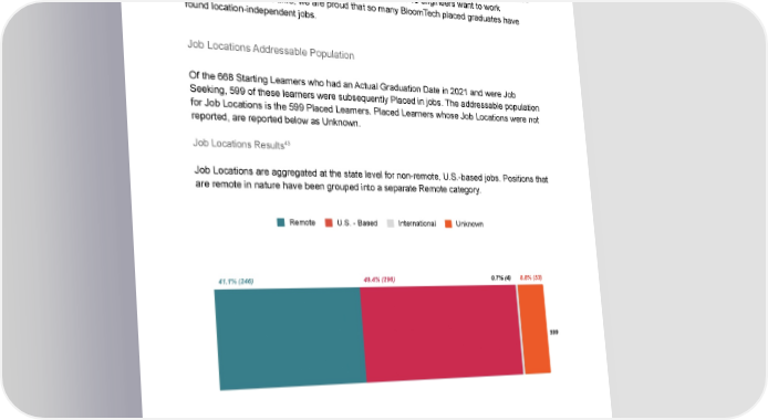 41 Job Locations BloomTech’s fully online model means that learners can gain a tech education from anywhere. Increasingly, BloomTech placed graduates can also work from anywhere, thanks to the prevalence of remote jobs. In 2021, the trend of remote and hybrid positions continued. These location-independent roles are even more prevalent among tech jobs. Given that 7 of 10 engineers want to work 42 remotely most of the time, we are proud that so many BloomTech placed graduates have found location-independent jobs. Job Locations Addressable Population Of the 668 Starting Learners who had an Actual Graduation Date in 2021 and were Job Seeking, 599 of these learners were subsequently Placed in jobs. The addressable population for Job Locations is the 599 Placed Learners. Placed Learners whose Job Locations were not reported, are reported below as Unknown. 43 Job Locations Results Job Locations are aggregated at the state level for non-remote, U.S.-based jobs. Positions that are remote in nature have been grouped into a separate Remote category. 41 Management’s criterion for defining Job Location is determined from the location associated with the learner's first Recorded Offer. 42 Source: https://terminal.io/state-of-remote-engineering 43 The addressable population for job locations calculations was 599 Placed Learners.