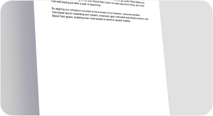 Definition of Success Our commitment to learner success is the foundation of the entire BloomTech model. The company was founded on aligned incentives, meaning we succeed when our learners succeed. We have stayed true to that essential vision. In late 2021, we introduced our 110% Tuition Refund Guarantee. Here’s what the 110% Tuition Refund Guarantee means: We’re so confident that graduates will get a job if they follow our program that we’re willing to not only refund their tuition but also pay them if they don’t find 2 that well-paying job after a year of searching . By aligning our company’s success to the success of our learners, everyone benefits. Individuals launch rewarding tech careers; employers gain motivated and skilled workers; and BloomTech grows, enabling even more people to achieve upward mobility. 2 Terms apply. All tuition types are not eligible for Tuition Refund Guarantee. Graduates must fulfill weekly career commitments in order to qualify.